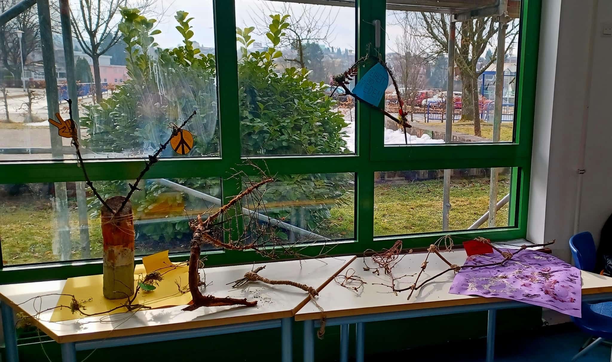 Am Dienstag begannen wir, unsere Kunstwerke zusammenzustellen. Es entstanden fantasievolle Ideen: Schaukeln für Vögel, Herzen aus Zweigen und viele weitere kreative Formen. Danach stellten wir unsere eigenen Farben her. Aus Roter Bete, Kohle, Kreide und verschiedenen Gewürzen entstanden natürliche Farbtöne. Mit diesen Farben bemalten wir unsere Kunstwerke und gaben ihnen den letzten Schliff.